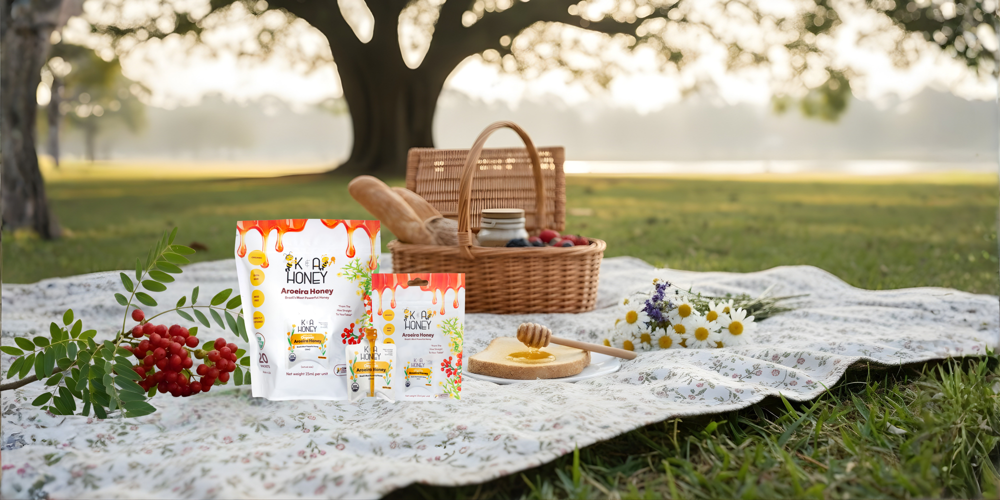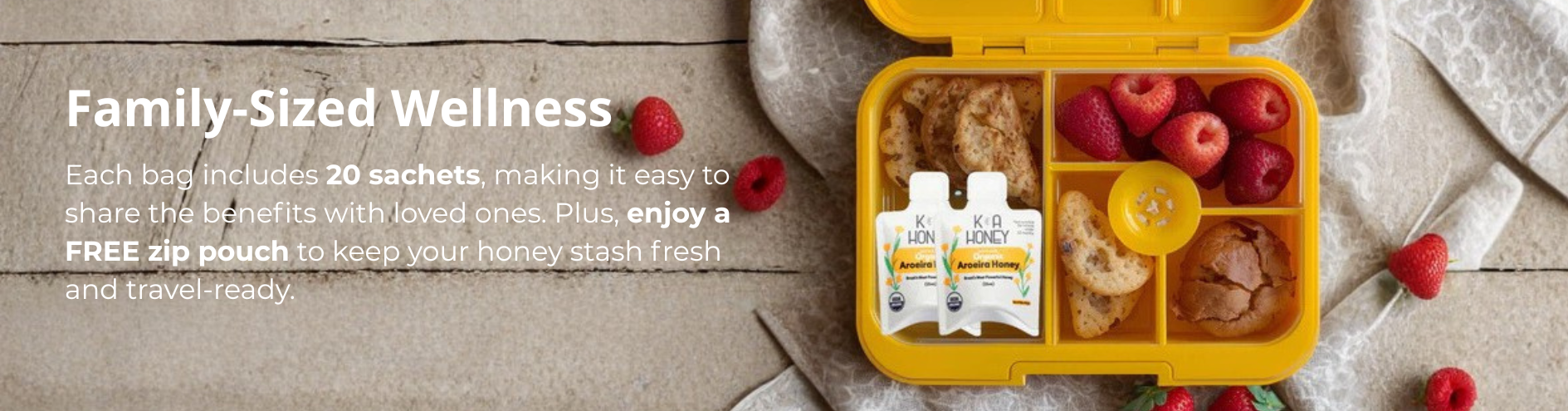 Organic Aroeira Honey Sachets in ready-to-enjoy portions. Family Size includes 20 easy-tear sachets in compostable, resealable packaging—perfect for sharing, gifting, or on-the-go use.