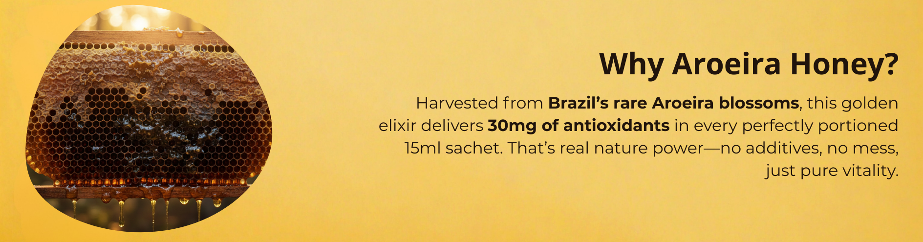 Organic Aroeira honey sachets in a compact three-pack, perfect for on-the-go snacking, gifting, with compostable resealable packaging and sustainability
